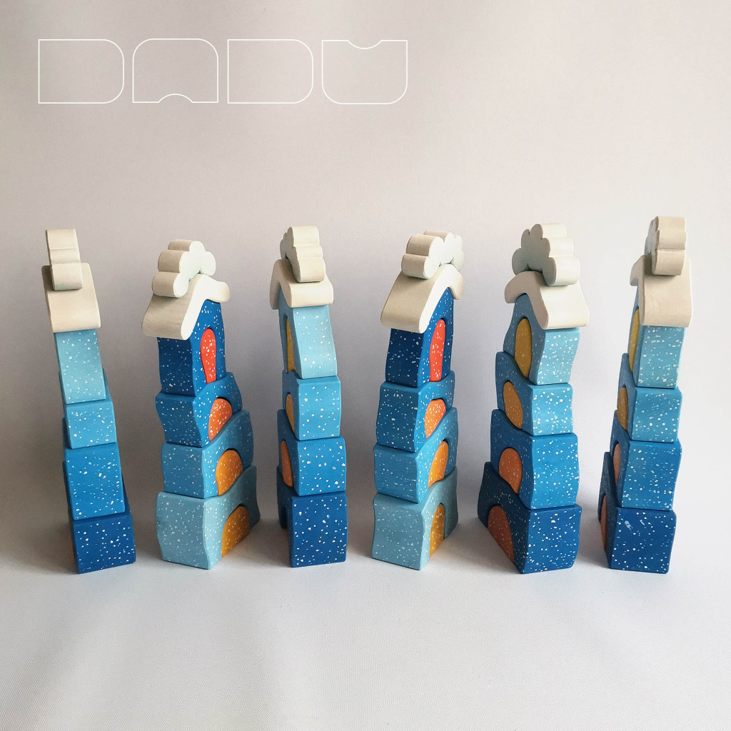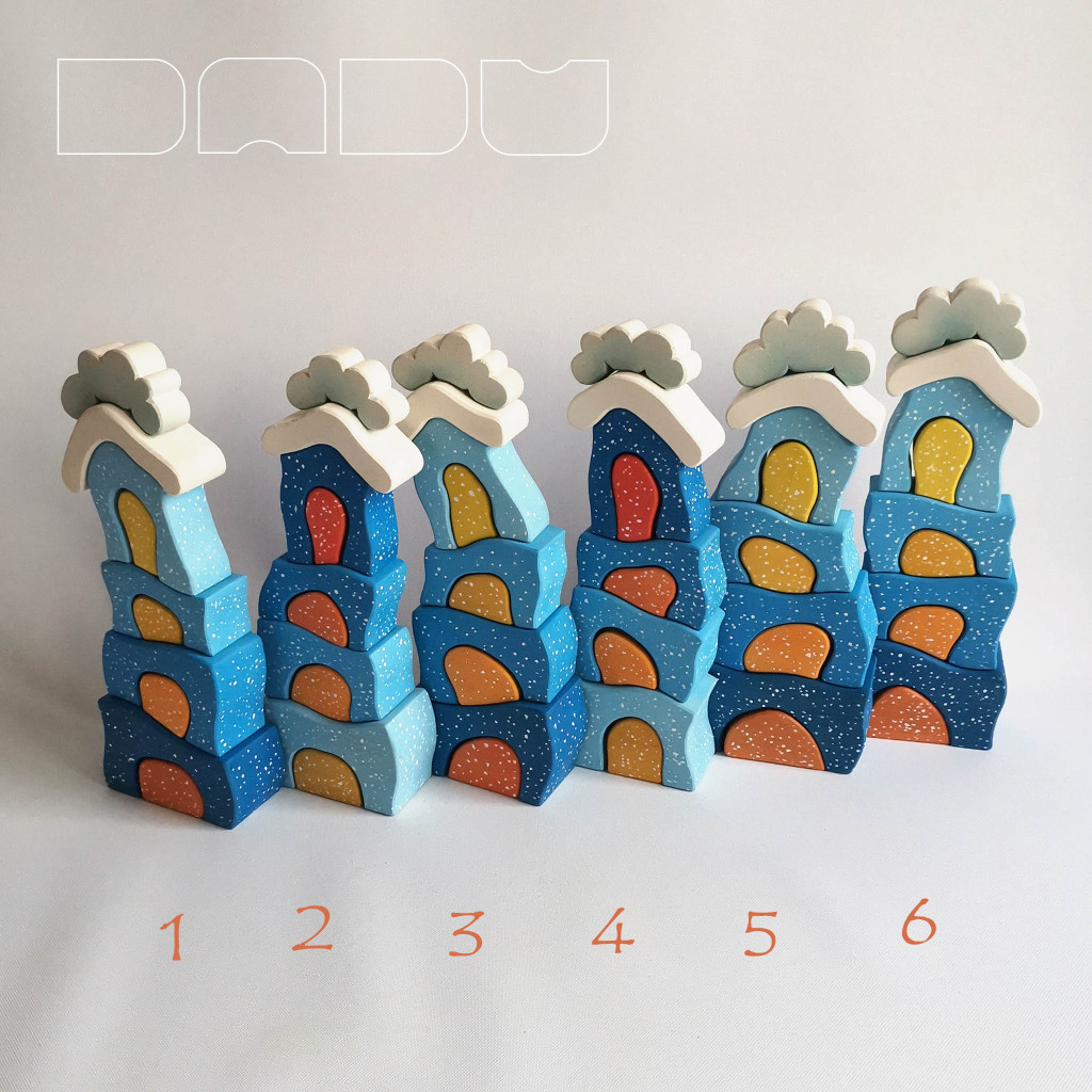 The DaduVillage is a continuously expandable building toy that can be a part of children's lives for many years. From the cheerful, brightly colored houses, even the very little ones can ably put together a small street, and older children can use them to conjure up a fabulous environment for all kinds of role-playing games. You can vary it with other toys: building blocks, field table, ball courts, train builders, and almost anything you can find in a children's room.